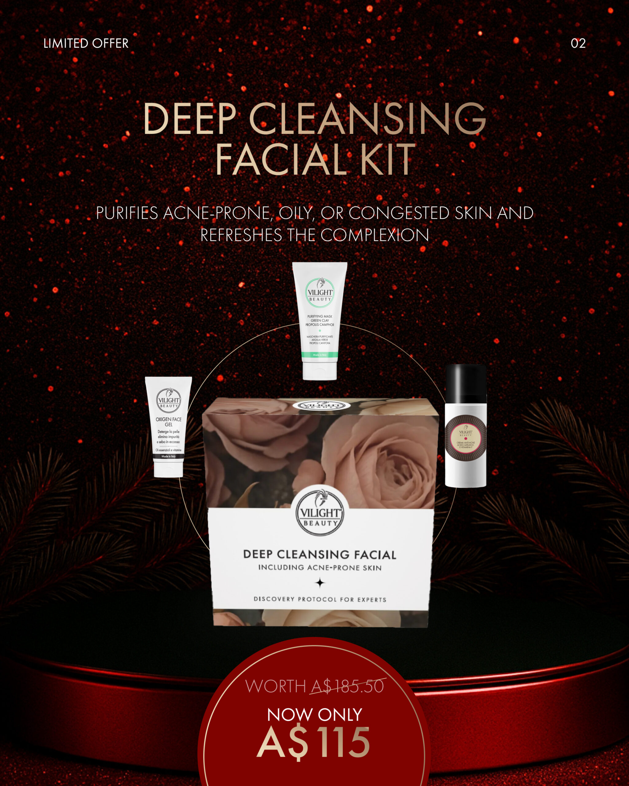 The Deep Cleansing Facial Kit is a professional-grade purifying routine that targets acne-prone, oily, or congested skin. It deeply cleanses pores, regulates sebum, calms irritation, and refreshes the complexion for a clearer, smoother appearance.